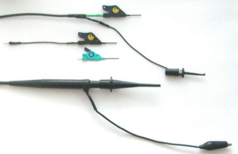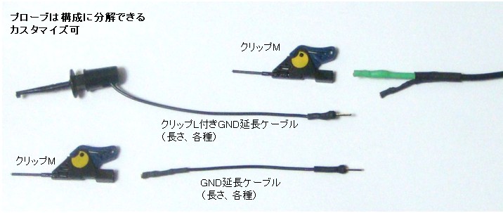 上:ストレージオシロ、下:普通のオシロ 1.GNDケーブルの長さが違う(GNDケーブルの長さはオプション選択) 2.先端クリップを選択できる(オプション) 3.ヘッド部が小さく軽いのでターゲットに負担が少なく掴める |