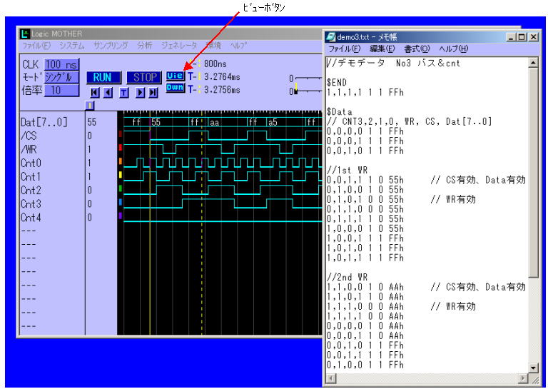| 以下のように、アプリ画面とデータファイルのエディタを同時起動します。(エディタ選択自由) エディタで修正したら、アプリのビューボタンをクリックします。これで、画面表示が更新されます。 画面表示の波形がそのままRUNボタンで出力できます 出力は、ロジアナのICクリップケーブルをそのまま使い、接続した外部機器に対して実行されます ロジックアナライザでありながら、信号発生器としても高機能となっています |