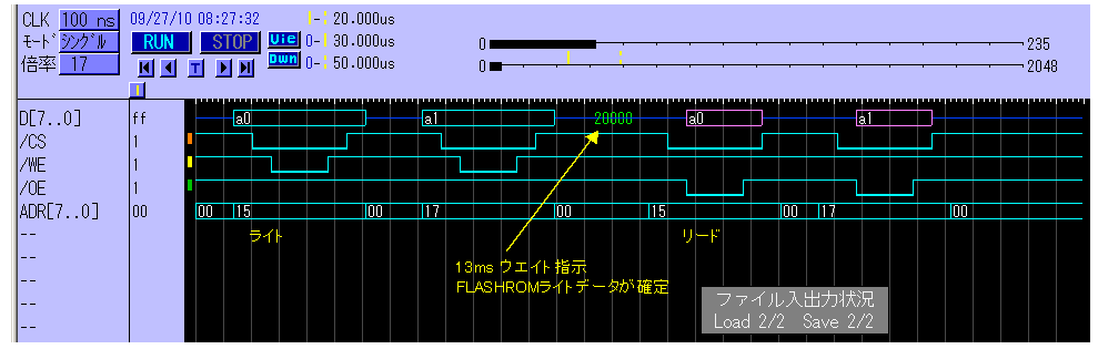 FLASHROMの書き込み完了を待つために、ウエイトコマンドで、この時のサンプリングCLK 100ns を20000h 倍 = 13ms をウエイト指示