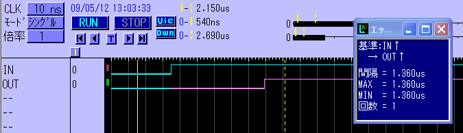 10nsの精度でサンプリングして、右分析ウインドウ内、IN↑