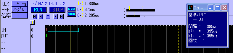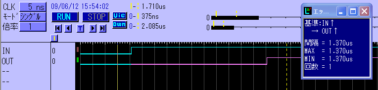 より正確に計測するには数回RUNします。信号OUTの立ち上がりがゆらぐことがあるはずです。その約中央値を採用して下さい