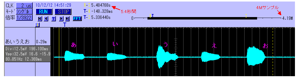 合計5.4秒間(2カーソル間)、”あ い う え お” を区切りながら発声したものを連続サンプルしています。