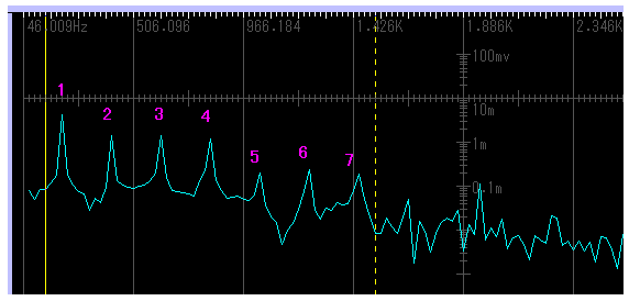 中心周波数は、1の207 Hz。その倍音成分が、2〜7。7は、0.182mV の微電圧も検出できている。対数目盛なので、1(中心周波数)と7の電圧差は、20倍以上ある。