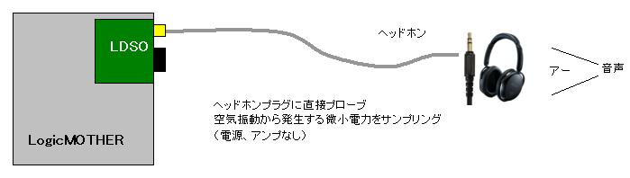 ヘッドホンを使いました。ヘッドホンに向かって発声すると、3極プラグから電圧が出ます。音を感じて空気振動から微小発電します(電源、アンプなしで)。この電圧を直接サンプリングしてみます
