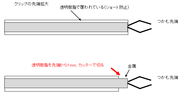 | (クリップの色が違うが、同じものです) 先端は、薄い樹脂で覆われている(ショート防止目的) その樹脂が、邪魔して、つかんだ時、クリップが持ち上がってしまう そのままでも使えるが、不意に触ると、ICピンに、よくない力が加わる |