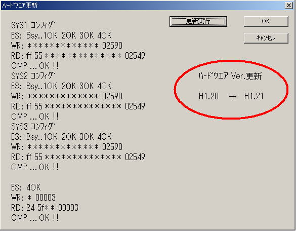| 更新時間は、約数分。 最後に、赤丸内の更新Verが表示されます。 それで完了です。”OK”ボタンをクリックして終了して下さい。 ハードウエアが新回路としてコンフィグレーションされます。(指示が無い限り、USB接続のまま、本アプリ起同のままでOK) |