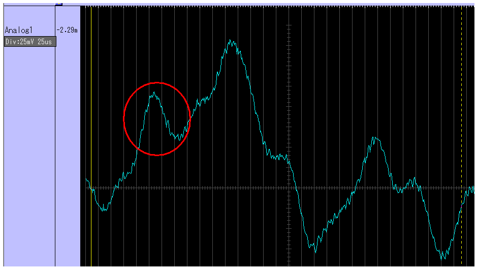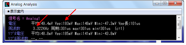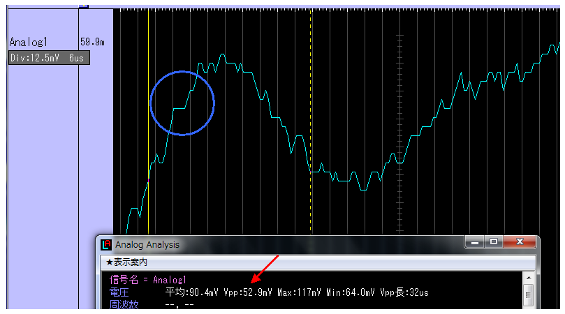 分析windowで2カーソル間のVppが計測されていますが赤矢印、これも少し違っています。8bitでは解像度最小値で4捨5入があるためです
