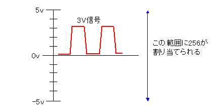 普通のオシロの場合ですが、レンジ=±5Vならそこに8bit解像度の256が割り当てられます