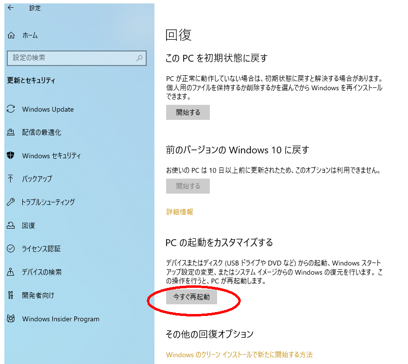 3.「PCの起動をカスタマイズする」内の「今すぐ再起動する」をクリック