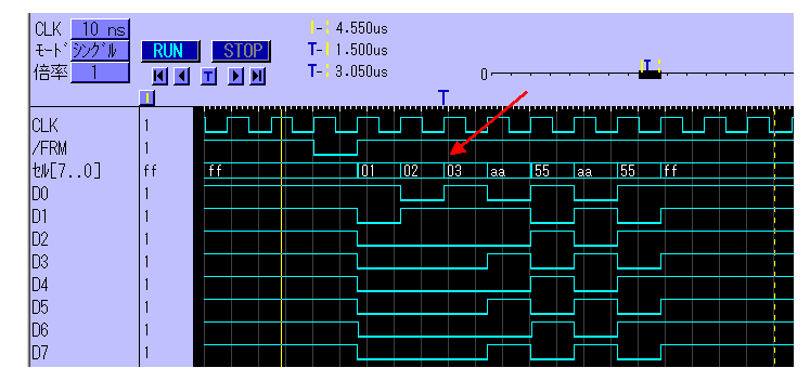 トリガーマークの下を見ると、目的のデータセル中の 01h → 02h → 03h を検出しています。