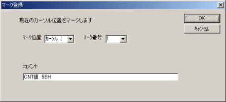 | カーソル位置をマークします。どちらかのカーソルをマークしたい場所に置きます マーク位置:2本カーソルの内どちらかをを選択する マーク番号:1-8まであるので、どれでも選択する コメント:わかり易いようにコメントを書いておきます |