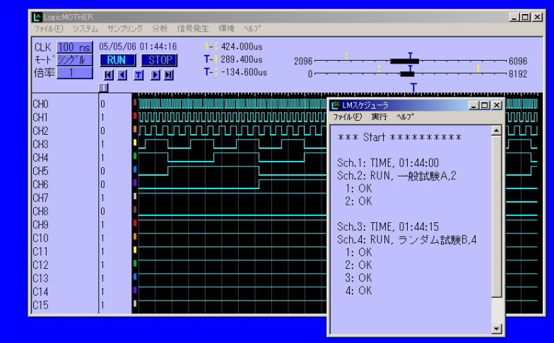 スケジューラは、標準付属のアプリケーションです。ロジアナアプリケーションと通信し、自動実行制御をします。 ●指定時刻になったら、自動RUNし、指定ファイル名で自動セーブ (指定時刻は複数定義できます。例えば、深夜、定時間間隔で、無人自動実行などもスケジュールできます) ●RUN回数を指定し、連続RUNごとに自動セーブ ●サンプリング条件設定ファイルが指定できるので、指定時刻ごとに、実行条件(トリガー、CLKなど)を切り替えることもできます ●スケジュール入力は、テキストファイルに、 ”RUN、ファイル名、回数” のようにテキストコマンドを入力する簡単な方式です。プログラム言語は使用しません。 (例) TIME, 01:44:00 //時刻 1:44:00 になるまでまで待つ RUN, 一般試験A, 2 //実行&セーブする。ファイル名 = 一般試験A、連続実行回数 = 2 |
