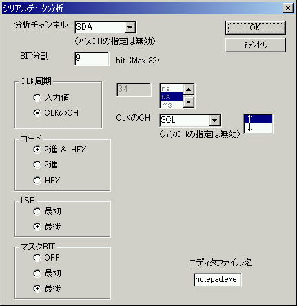 | シリアル分析機能のマスクBITは、境界中の最初か最後の1BITを数値化から除外します シリアルフォーマット I2C を例に説明します |
