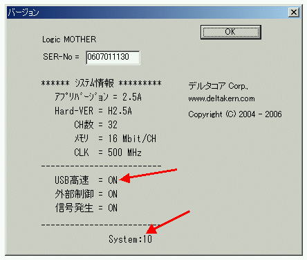 高速USB (V2.5: 2006/6/30) ※USB高速 = ON、対応済み ハードエラー対応機能強化 (V1.6G: 2005/10/24) ※Systemのあとの数字が "1" の場合、対応済み